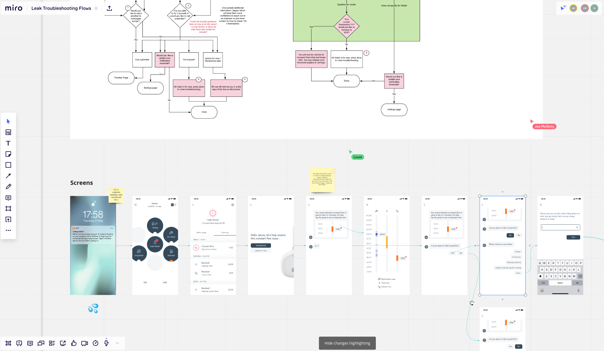 I worked on improving the current troubleshooting and installation journeys, finding ways of easily guiding customers through a complex device installation process but also enabling them to solve potential water leaks in their properties by themselves and take some of the pressure of our call centres. I introduced Miro to the team as an innovative way to ease collaboration on this with a variety of stakeholders, to map out the entirety of the UX flows and help them gain a holistic view of the scope of work needed for their respective teams.